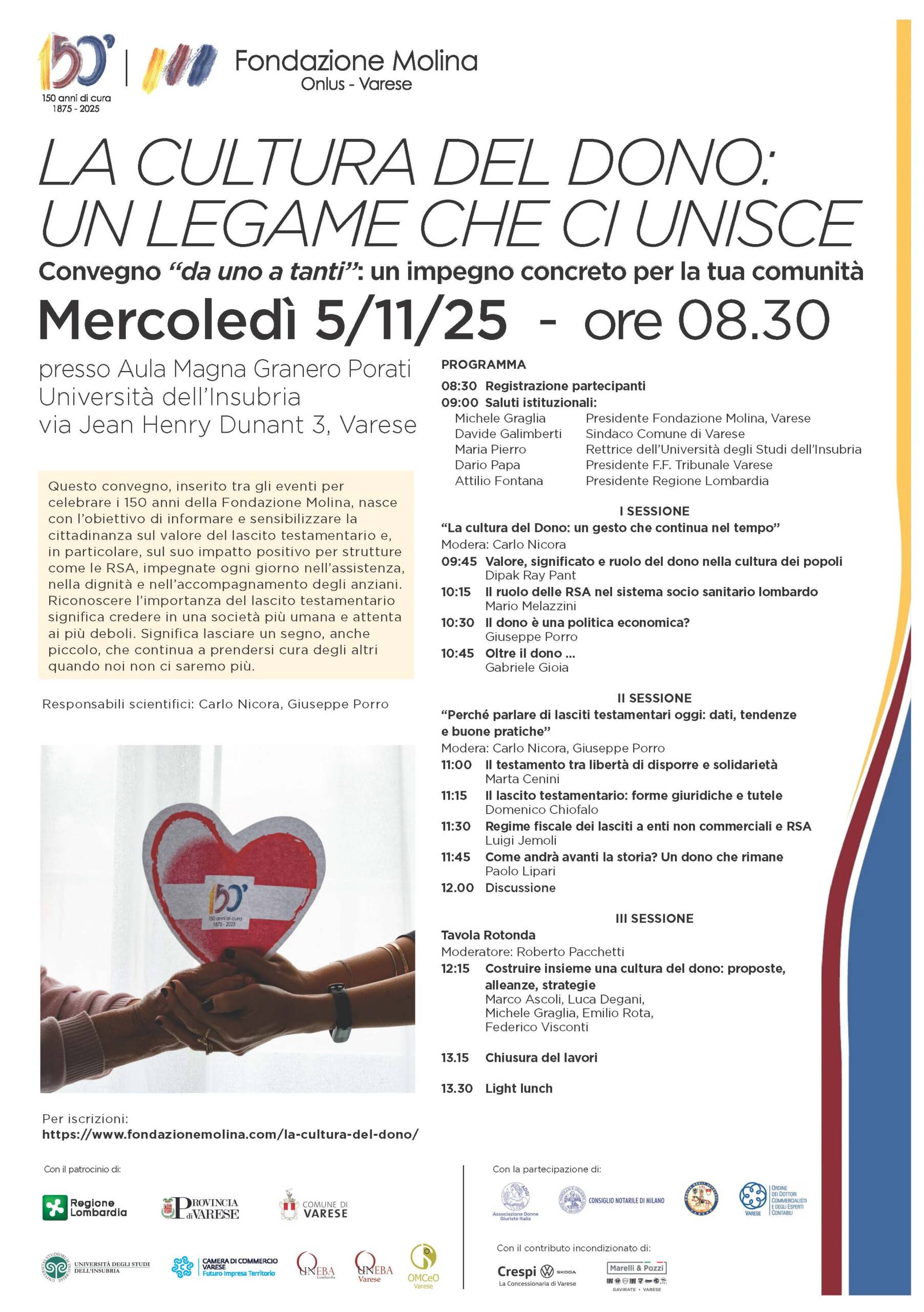 Nell’ambito delle iniziative promosse per la celebrazione del 150° anniversario della Fondazione Molina, vi invitiamo al terzo evento dal titolo “La cultura del dono: un legame che ci unisce”, un convegno con l’obiettivo di informare e sensibilizzare la cittadinanza sul valore del lascito testamentario e, in particolare, sul suo impatto positivo per strutture come le RSA.